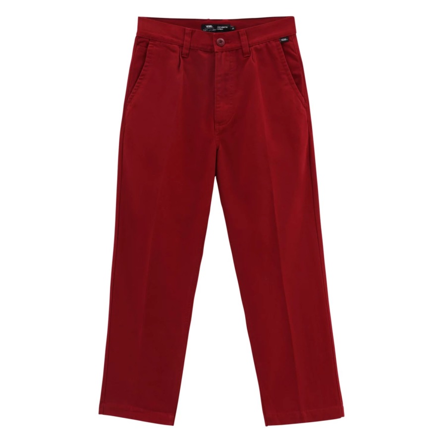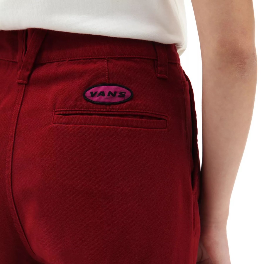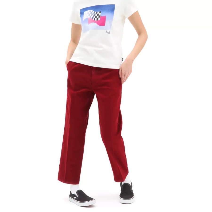 Pushing the boundaries and thinking differently is nothing new to Vans surfers Alex Knost (from Costa Mesa, California) and Lee-Ann Curren (from Biarritz, France). Whether in the water or out, they know that true self-expression means being unapologetically yourself. In this second season of their genderless head-to-toe collection from Vans, Alex and Lee-Ann worked together to integrate new colors and materials, driving a unique approach to progression with product and inclusivity.Their "outside-the-lines" way of thinking, both on a wave and off, has come to life in the new Vans X Curren X Knost Pant. Inspired by 70s interiors and automotive design, this classic chino pant highlights a timeless aesthetic with retro flair. Embroidered Drop V bartacks offer reinforcement with a heritage twist while other notable details bring plenty of Off The Wall style to this wardrobe essential: the new "V" belt loop detail on the back waistband, a permanent pressed crease on both the front and back of the legs, and the new flag label sewn internally to the hem seam for added branding when legs are cuffed. Because for Alex and Lee-Ann, it's about more than creating a collection that people look good wearing-it is about feeling good when you are wearing it.