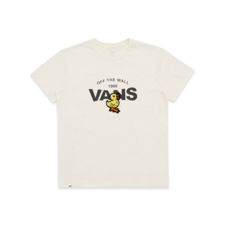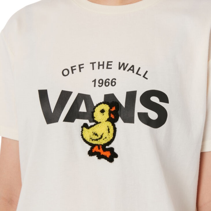 The Duckling T-shirt is a 100% cotton round-neck tee with a large basic Vans logo and duck pattern across the front.