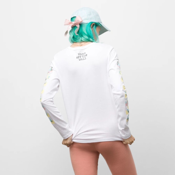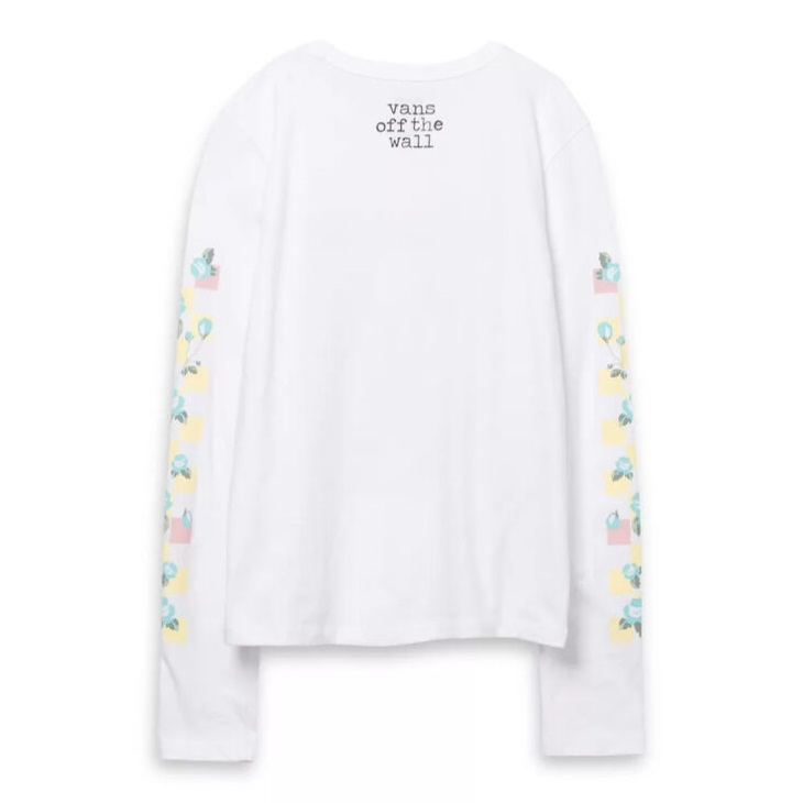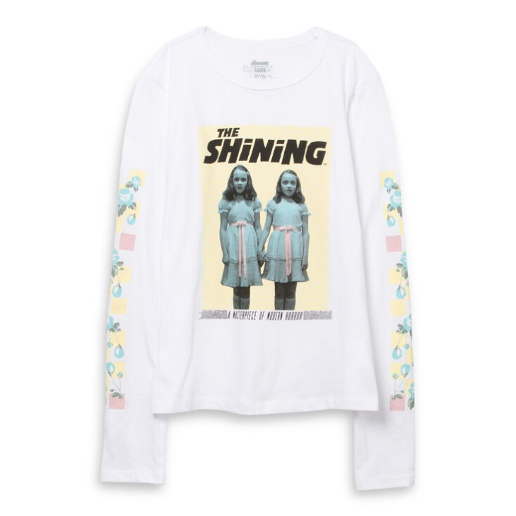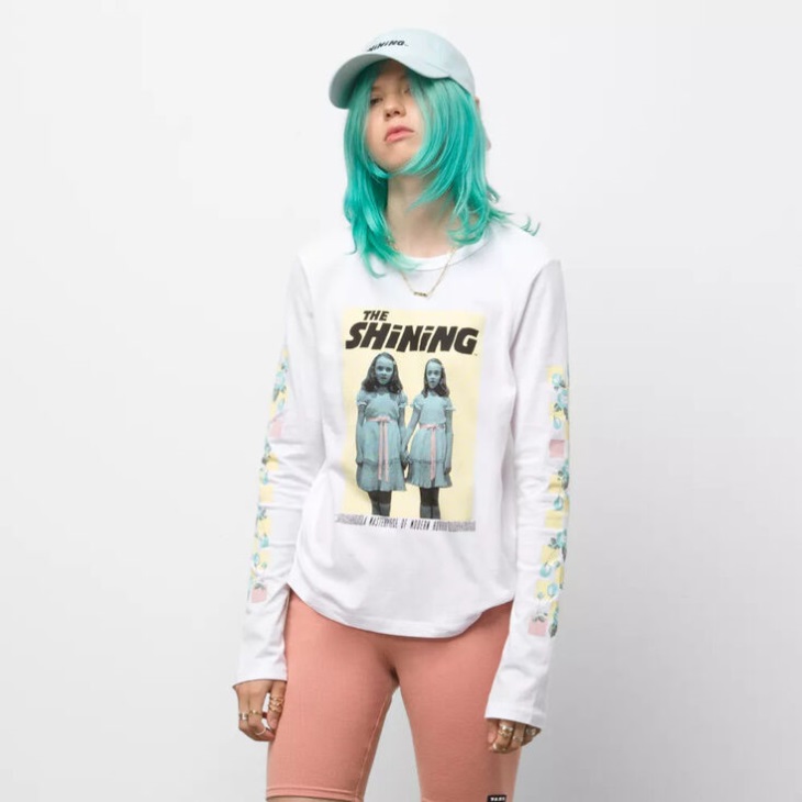 Relive the scariest moments of classic horror films with the Vans X Horror pack from Vans. Depicting scenes from your favorite Warner Bros. thrillers, this spooky collection brings these stories to life through unique and direct interpretations of the movies scariest scenes, famous posters, and frightening casts of characters. Featuring front graphics spotlighting the terrifying twins from the Overlook Hotel, the Vans x The Shining Long Sleeve T-Shirt will lure you in with their calls to come play, but dont be fooled-danger awaits. This baby tee also features checkerboard floral graphics at the sleeves. Model is 5 feet 9 inches tall and wearing a size Small. - Vans x Warner Bros. Entertainment Vans X Horror collection - Prints inspired by The Shining - 100% heavyweight cotton jersey - Long sleeves - Baby tee fit