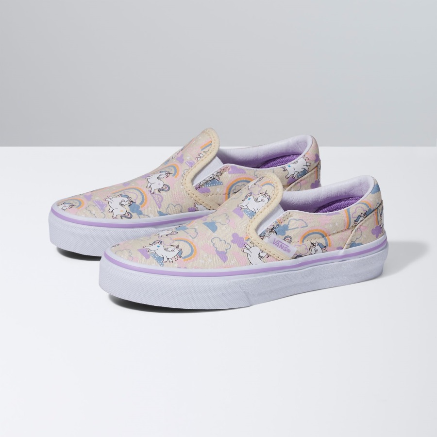 Featuring a whimsical rainbow unicorn print utilizing UV ink for a magical glow, the Mythical Glow Classic Slip-On is an everyday essential with true "Off The Wall" style. This iconic slip-on shoe also includes sturdy canvas uppers, supportive padded collars, elastic side accents, and signature rubber waffle outsoles.