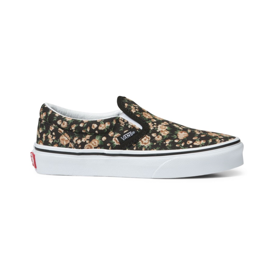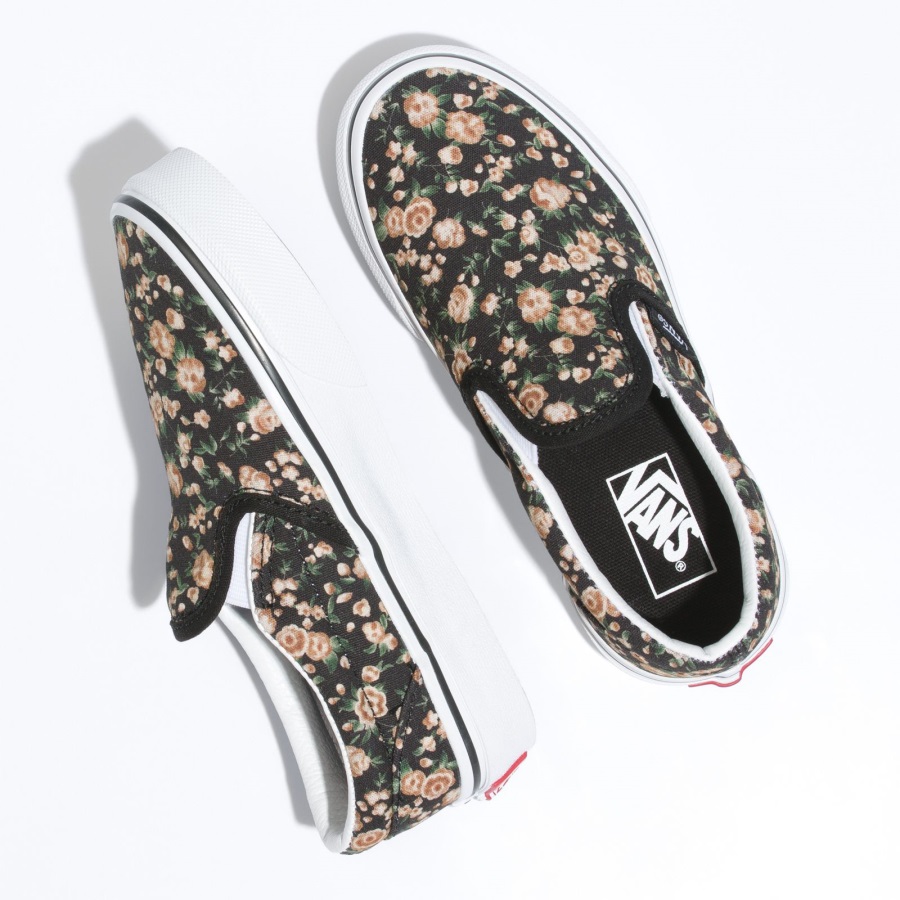 Featuring sturdy textile uppers with an allover pink rose print against a black background, the Rose Dreams Kids Classic Slip-On is an everyday essential with true "Off The Wall" style. This timeless slip-on shoe also includes supportive padded collars, elastic side accents, and signature rubber waffle outsoles.