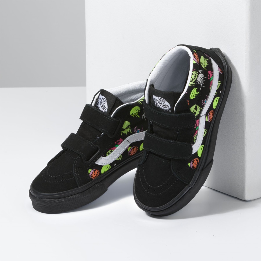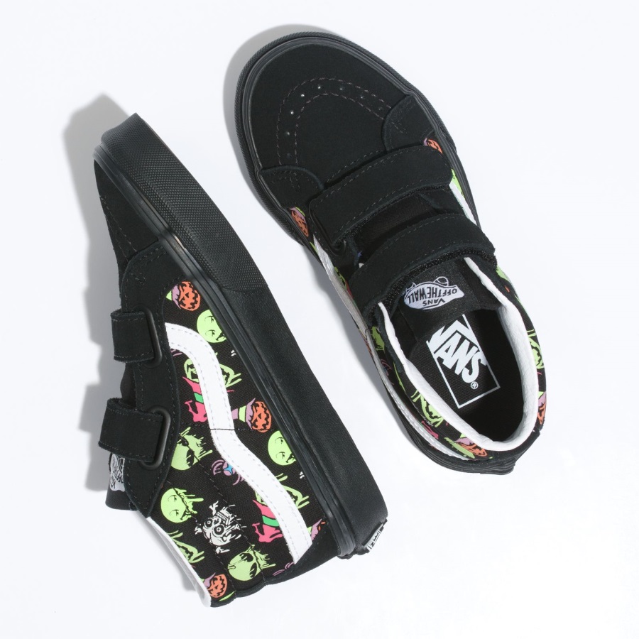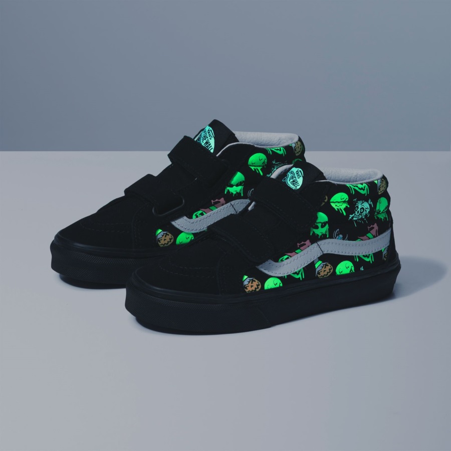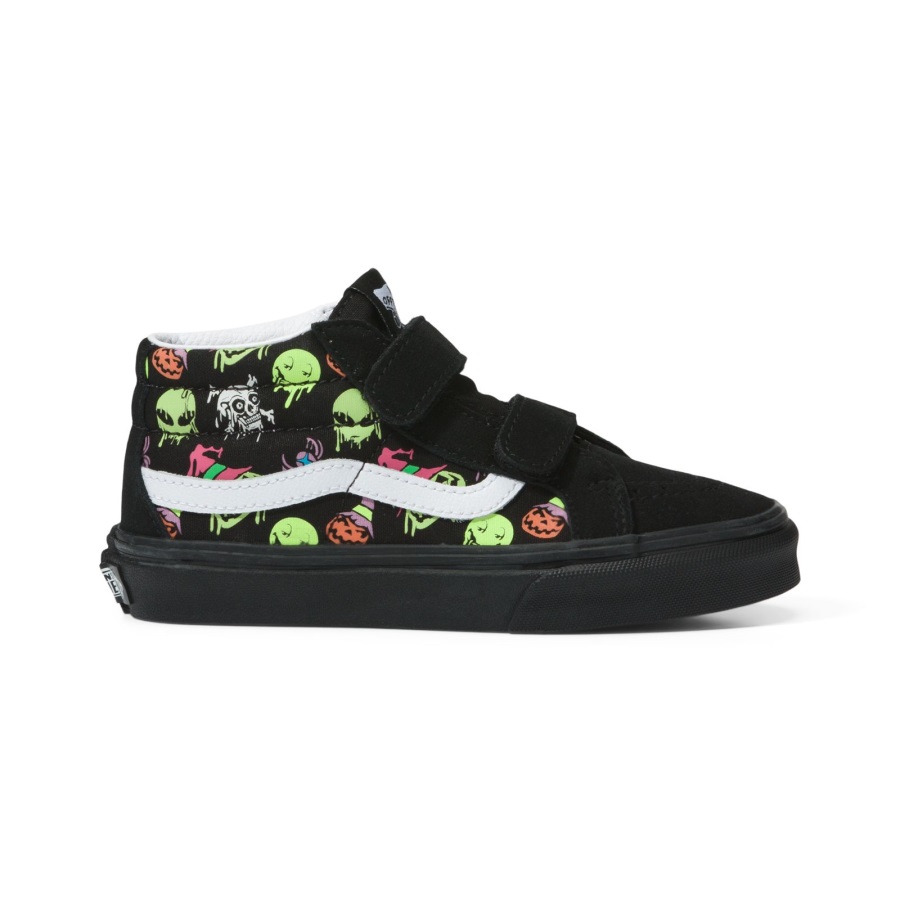 The Trippy Drip Kids Sk8-Mid Reissue V reimagines our legendary reissued mid top by swapping traditional laces for double hook-and-loop closures. Featuring jack-o-lanterns, witch hats, skeletons, and trippy smiley faces, this sidestripe style maintains its classic appeal while providing an easy, secure fit that will keep you comfortable all day.