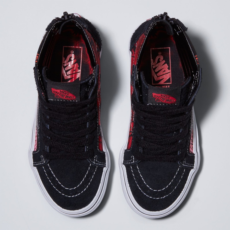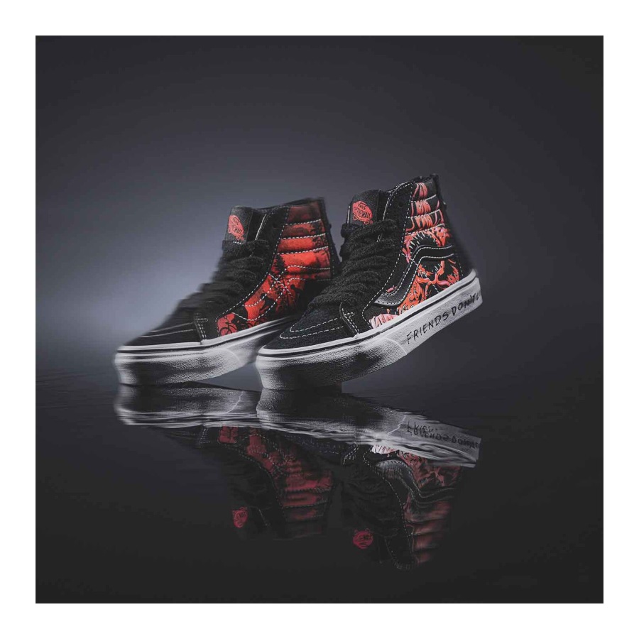The Vans X Stranger Things 4 collection brings the Stranger Things world to life. Travel to the Upside Down, Surfer Boy Pizza, Hawkins Indiana, and more through Vans' playful apparel and footwear. Featuring Demogorgon graphics and a red and black colorway honoring the show's iconic opening credits, the Vans X Stranger Things Sk8-Hi Zip blends our legendary high-top shoe with the original monster haunting the heroes of Hawkins. Along with a "Friends Don't Lie" print at the sidewalls, this sidestripe silhouette includes a zipper at the heel for an easy on-and-off fit, ensuring that you're always Off The Wall and Upside Down, ready for your next epic adventure. Just grab your group of best friends, a waffle(sole), and get ready to be propelled into the world of Vans X Stranger Things 4. Vans X Stranger Things collectionVans' legendary high topDurable suede and canvas uppersDemogorgon graphics"Friends Don't Lie" sidewall printRed and black colorwayZipper entry at the heelGlow in the darkLace-up closureSupportive padded collarsSignature rubber waffle outsoles