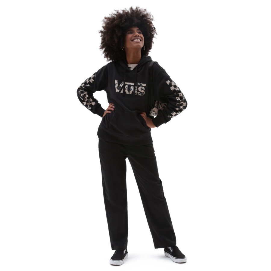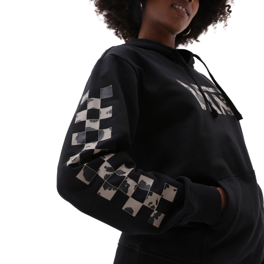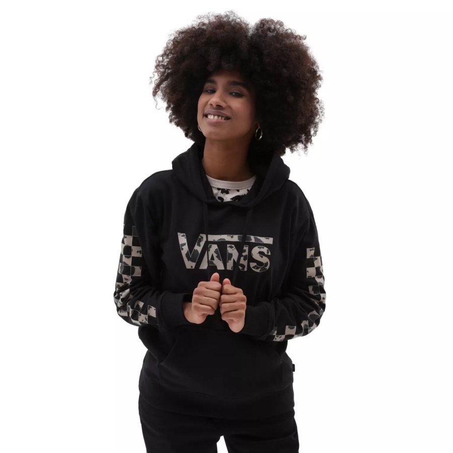 The Vans Dotty Check Pullover Hoodie has long sleeves, a front pouch pocket and the Vans logo on the front. It also has a checkerboard pattern down both sleeves and features a boyfriend fit.