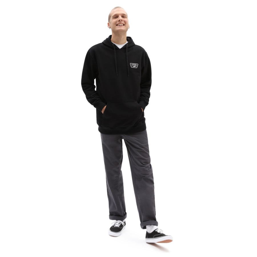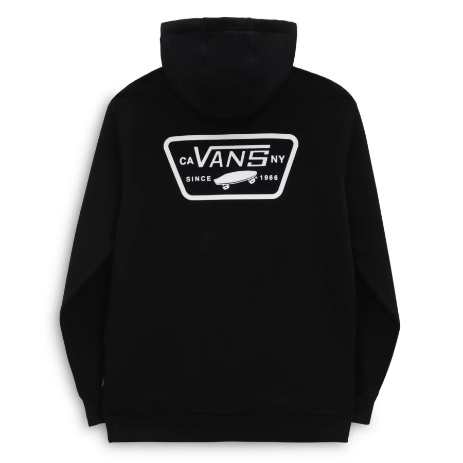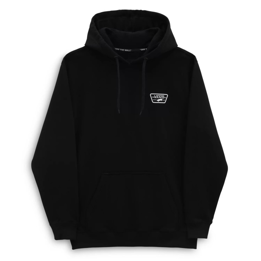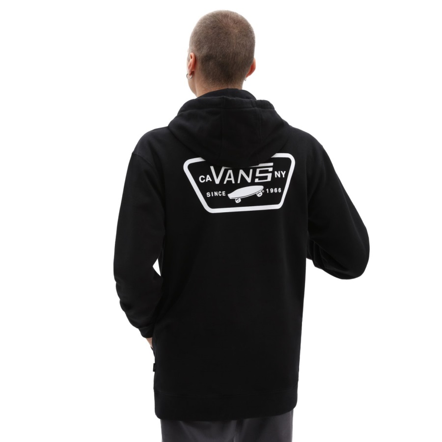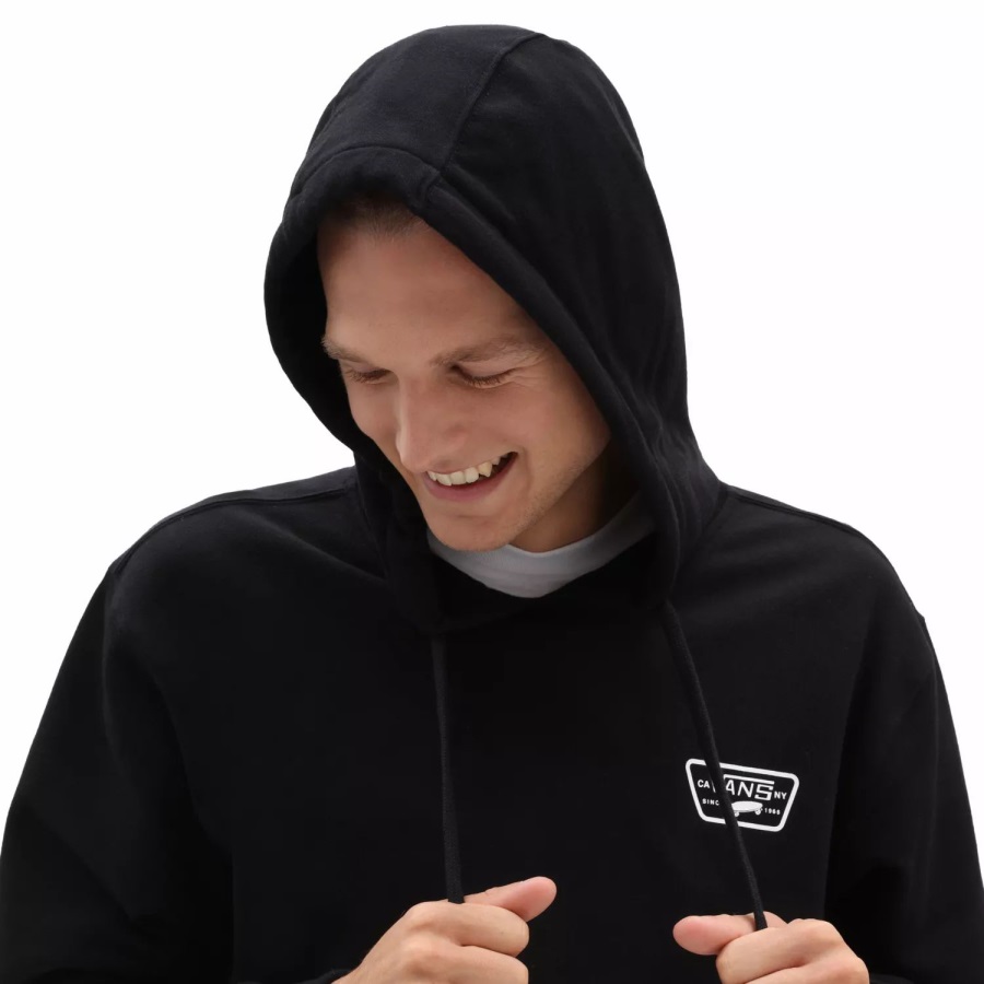 The Full Patched Pullover II Hoodie is a 60% cotton, 40% polyester fleece pullover hooded sweatshirt with a front pouch pocket and printed logo graphics on the left chest and back. Model is 183 cm tall and wearing a size Medium.